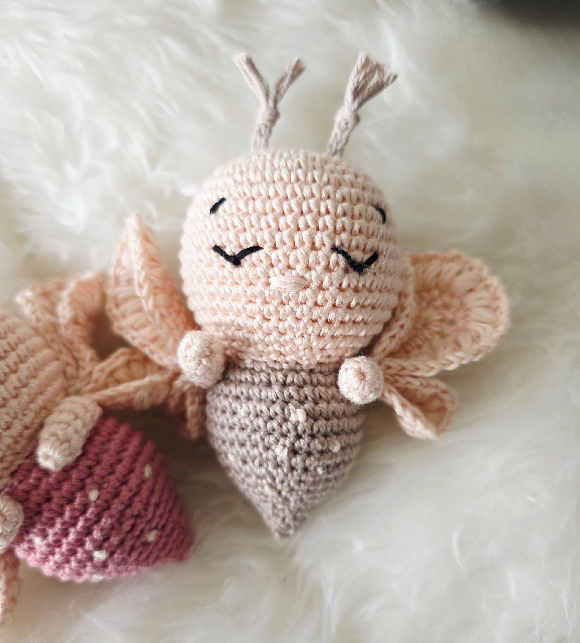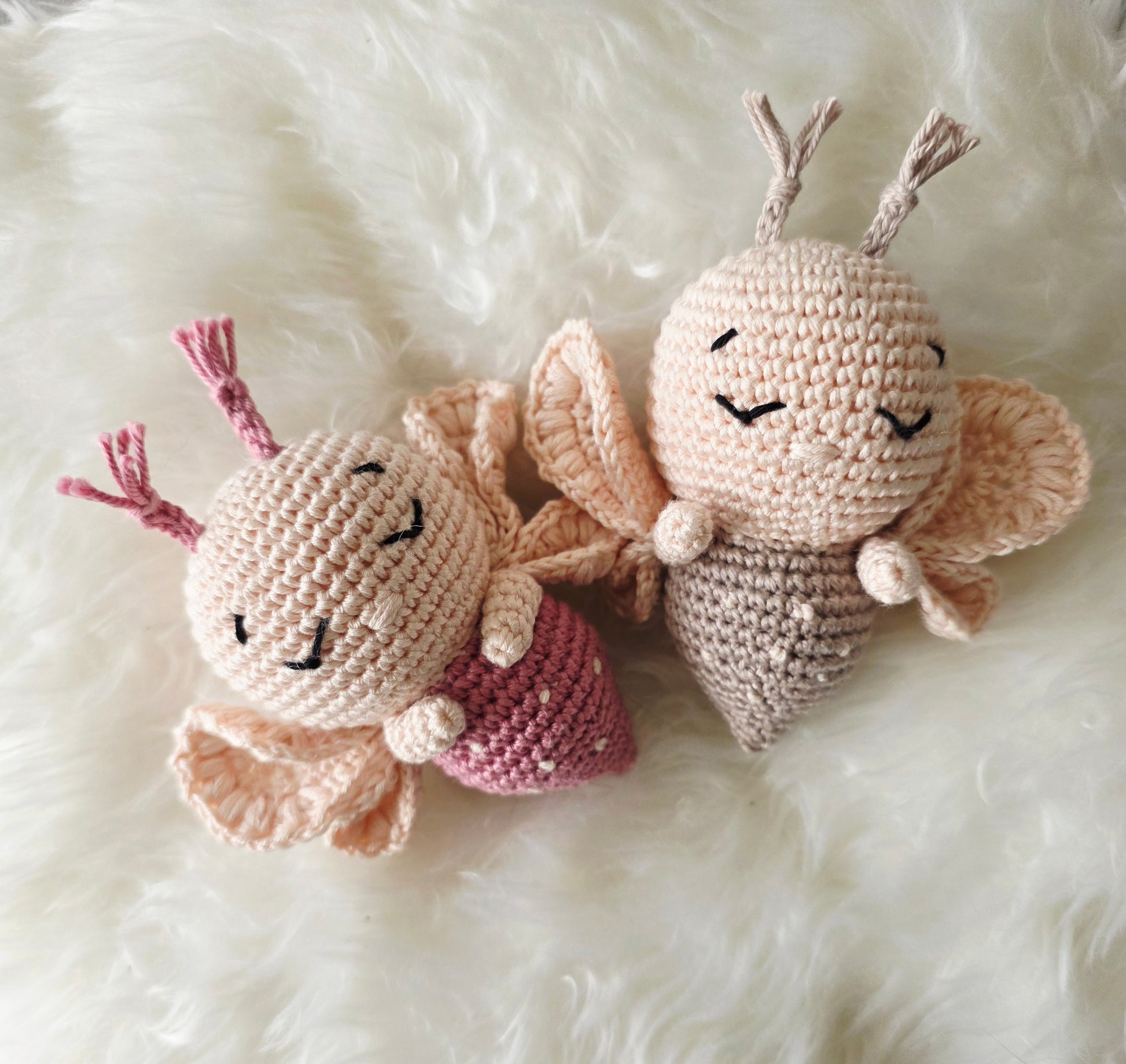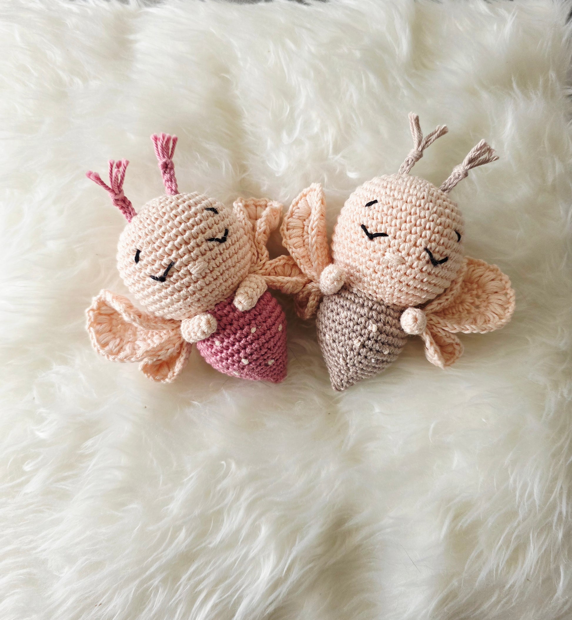 Diese handgehäkelte Babyrassel verzaubert mit ihrem zarten Design und ihrem liebevollen Gesichtsausdruck. Mit ihren weichen Flügelchen, kleinen Händchen und sanften Farben wird sie schnell zum ersten Lieblingsbegleiter deines Babys. Die Rassel ist etwa 11 cm hoch und perfekt für kleine Hände geeignet – leicht, kuschelig und sicher zu greifen.
